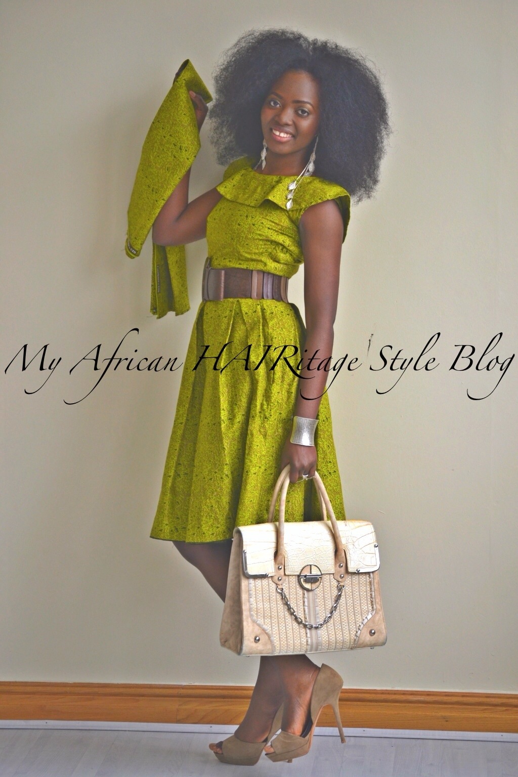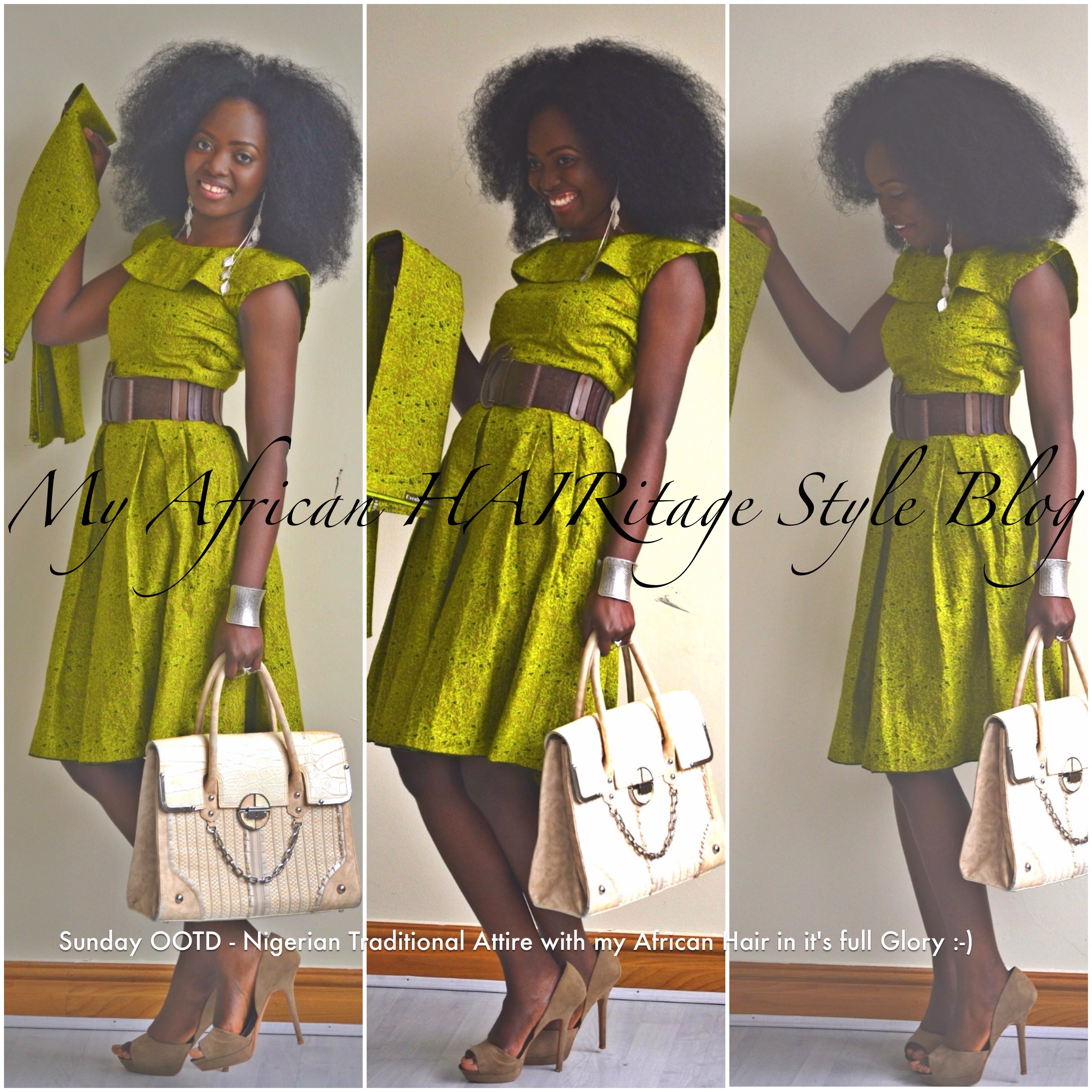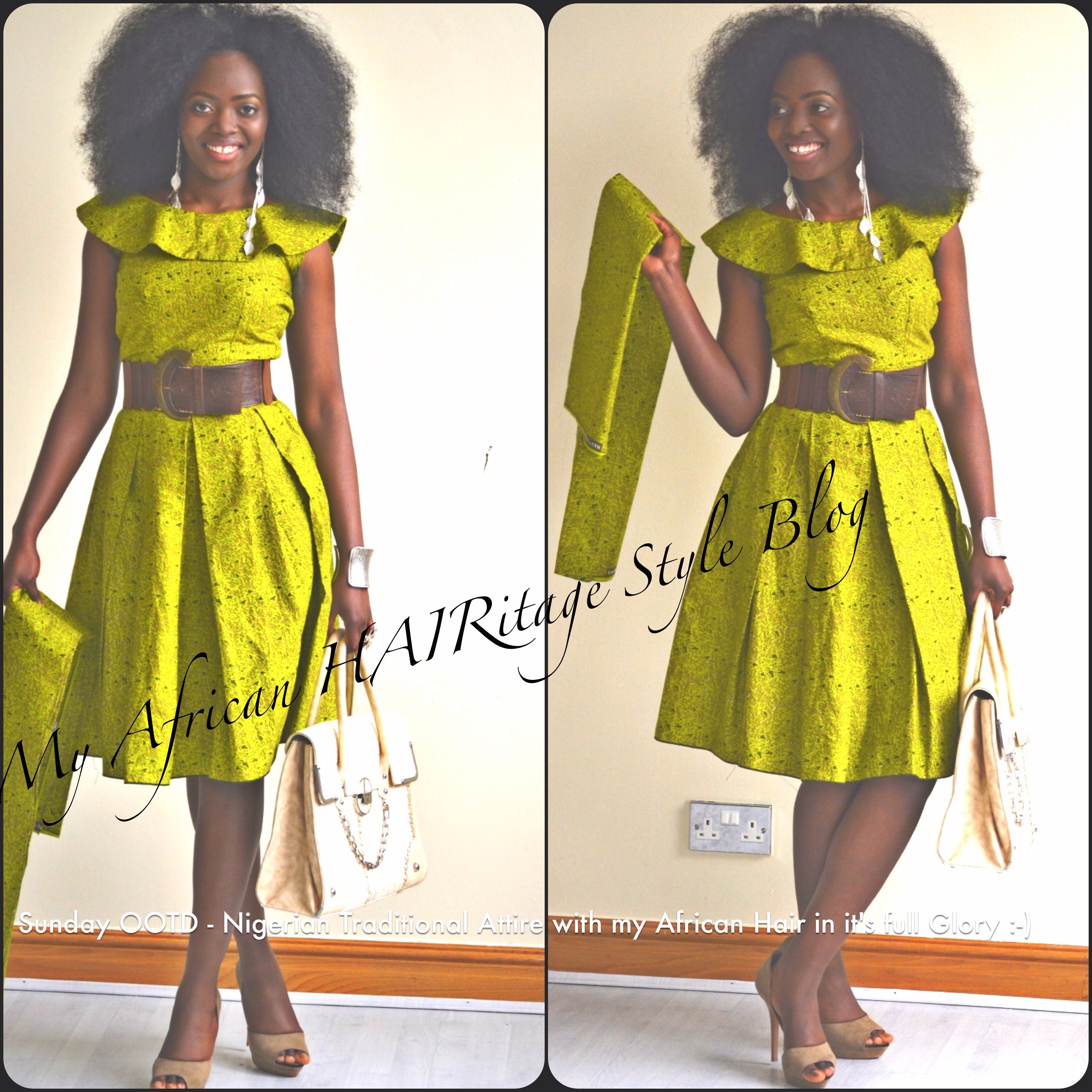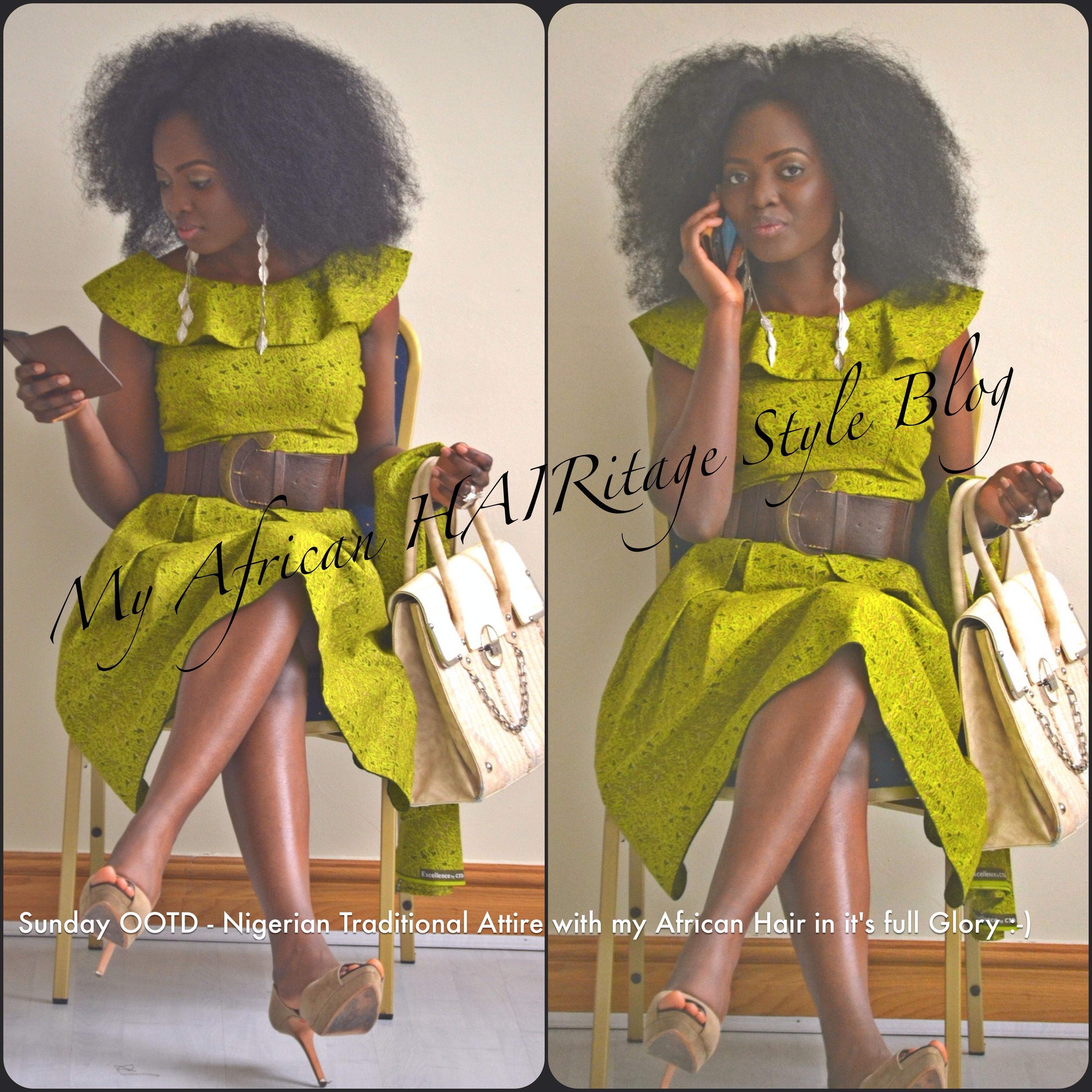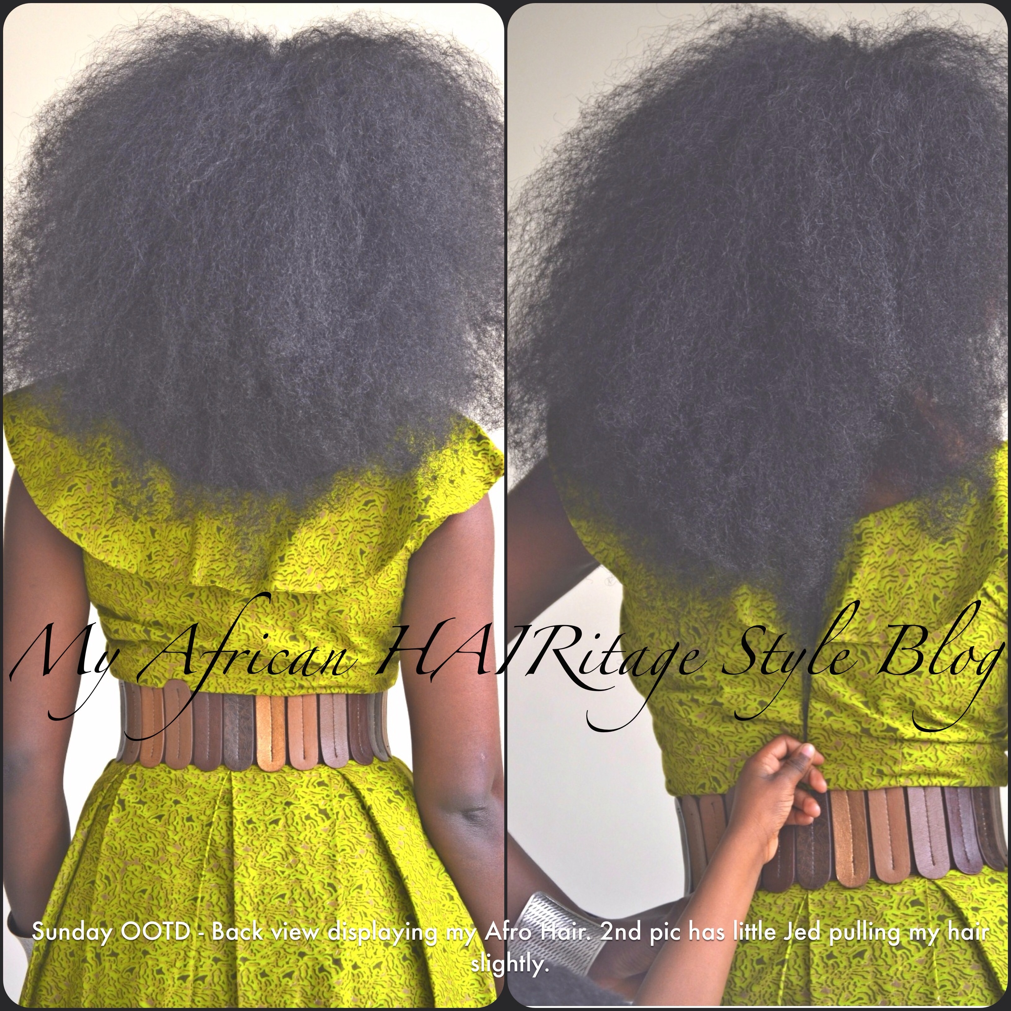 You know this post will not be complete without giving honour to the afro lol. As an African Queen I just had to compliment the dress with my Crown (aka my afro hair). This was the main accessory that brought out the beauty of this amazing traditional Nigerian print dress if you ask me! My hair was slightly blow dried to stretch it a bit to reduce the likelihood of my ends knotting up and tangling in it’s free state. Just in case I have not said it yet in this post. To the non-believers, as you can clearly see Nigerian ladies can actually grow their hair with proper care and knowledge. The picture below shows the back view of my hair (and the dress) and one of my little babies in church pulling slightly on my hair to see the length.