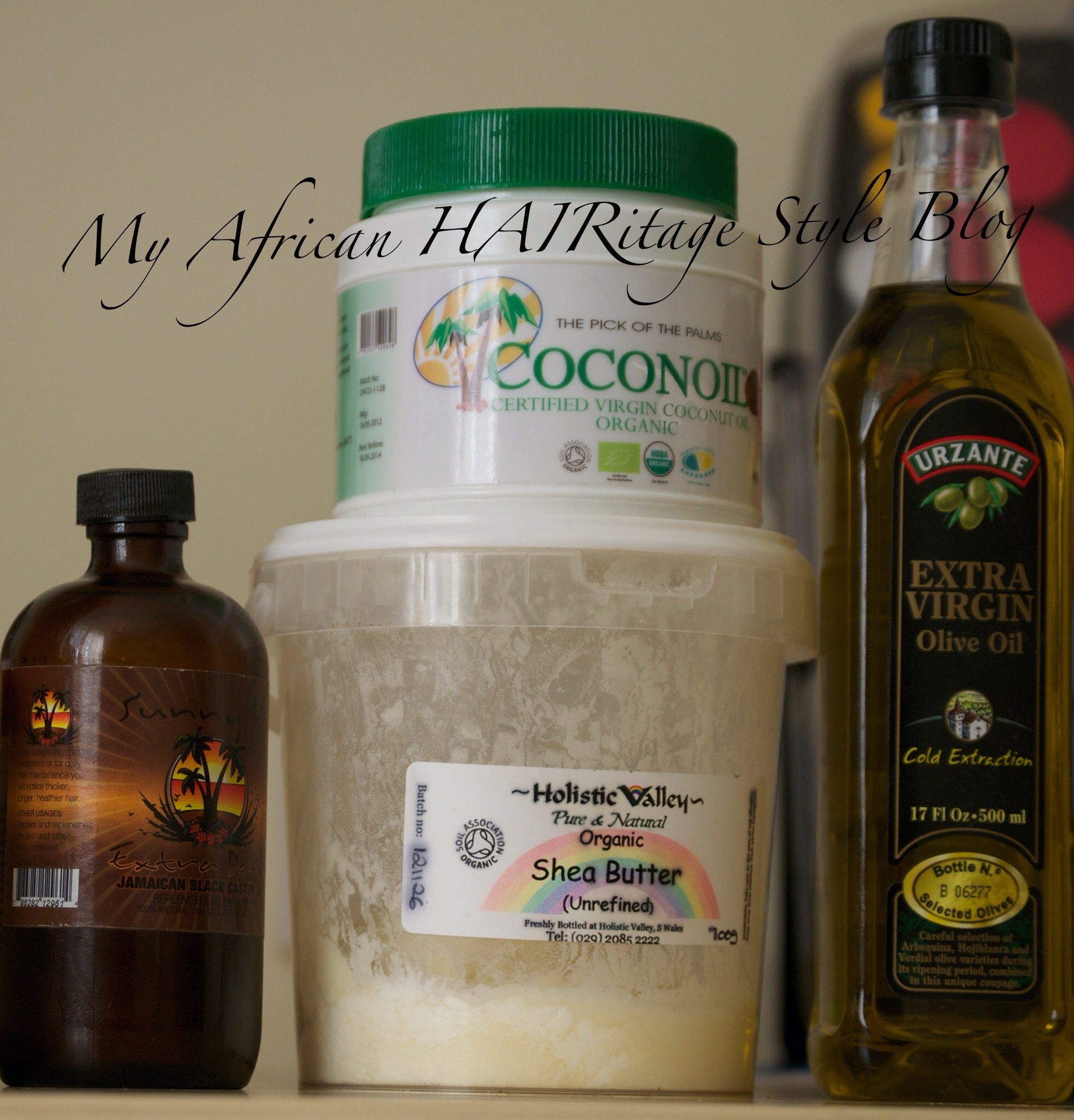 My Go To Oils & Butters: Extra Virgin Olive Oil, Extra Virgin Coconut Oil, Castor Oil and Unrefined African Shea Butter.